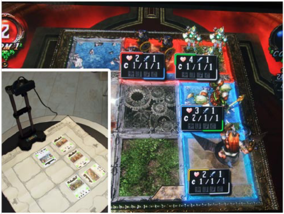 It is a collectible trading card game for the PlayStation 3. The game uses augmented reality to visualize the characters and effects on the cards. The player can choose between a computer or real opponent – local or remotely. Each player has a deck of cards that during each turn, they draw new cards. The playing files is a grid of nine squares, which the first player to conquer five squares win the game. The player can summon monsters to attack the opponent or use spells. Figure 3 shows the playing mat with cards and the camera setup on the small image and on the big image it shows the augmented view on the screen.
