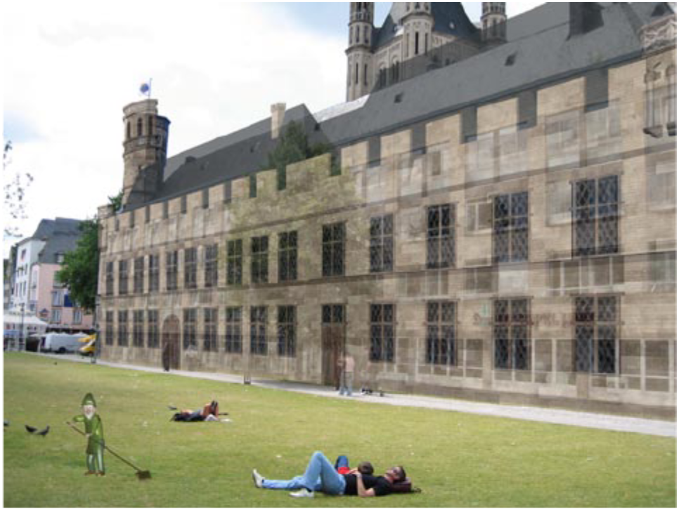 The game is based on a traditional German story about the existence of small elves who help citizens during the night until on day they disappeared. The plot of the game is that these elves are stuck in different time periods, and the goal is to find the elves by time traveling. The player needs to solve several tasks to free the elves. Figure 2 illustrates the original medieval building that was destroyed during the war superimposed to the reconstructed building. The game uses a head-mounted display and a handheld-based device for interaction. The action is executed by pressing a mouse button.